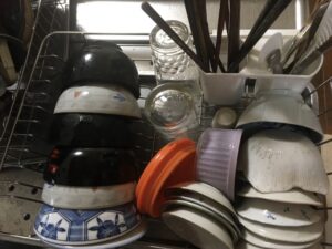 せっかく乾いた食器を片付けず、その上からまた食器を置く。